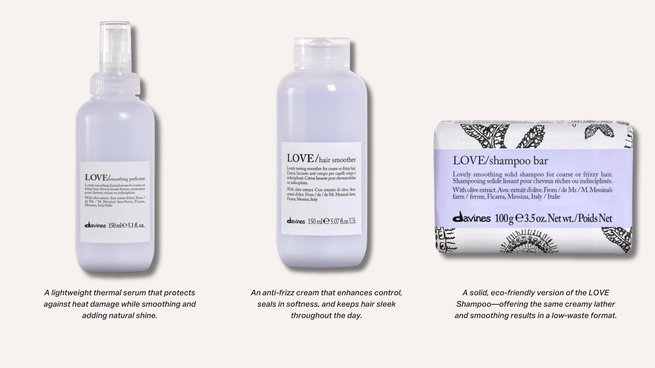 LOVE is part of Davines’ Essential Haircare family, specially crafted for coarse, frizzy, or unruly hair.